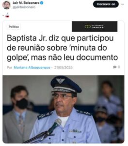 Durante seu depoimento à Corte, o ex-comandante afirmou que houve reuniões para planejar um suposto golpe de Estado e a apresentação de uma minuta com teor golpista aos comandantes das Forças Armadas. Baptista Júnior ainda afirmou em depoimento que um “brainstorming” foi realizado em uma das reuniões do golpe e que a prisão do ministro Alexandre de Moraes chegou a ser cogitada.
