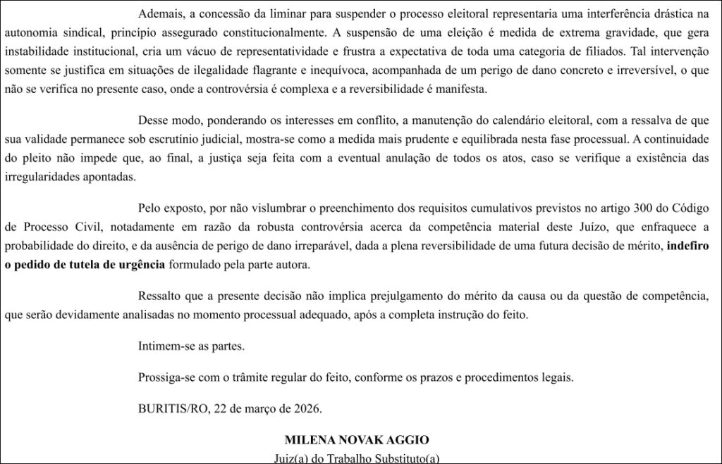 Na vara do trabalho de Buritis, a juíza Milena Novak Aggio analisou o pedido de tutela de urgência no processo nº 0000106-71.2026.5.14.0151 e decidiu de forma diversa.