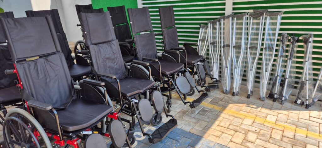 Durante a solenidade, também foram entregues cadeiras de rodas e muletas, reforçando o compromisso social do governo em atender pessoas com necessidades especiais e ampliar a inclusão.